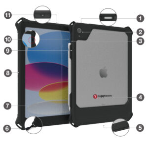 | 超輕薄設計 | 按鍵一體成型 | 資產標籤窗口 | 觸控筆置放架 | 可搭配肩背帶 |